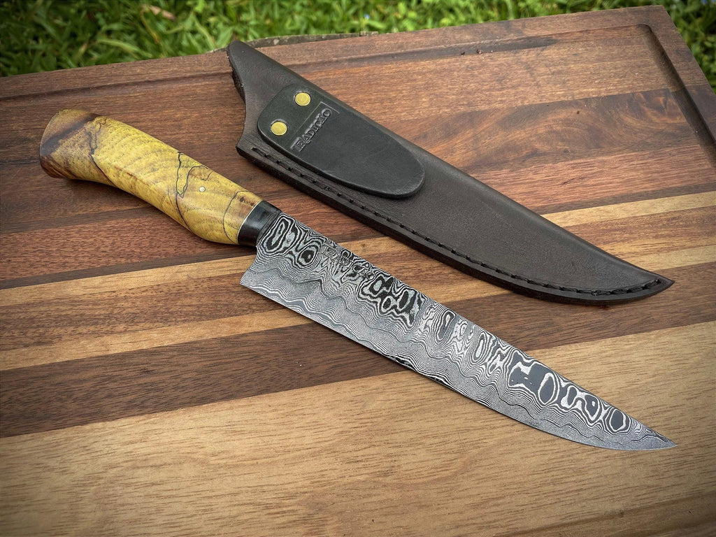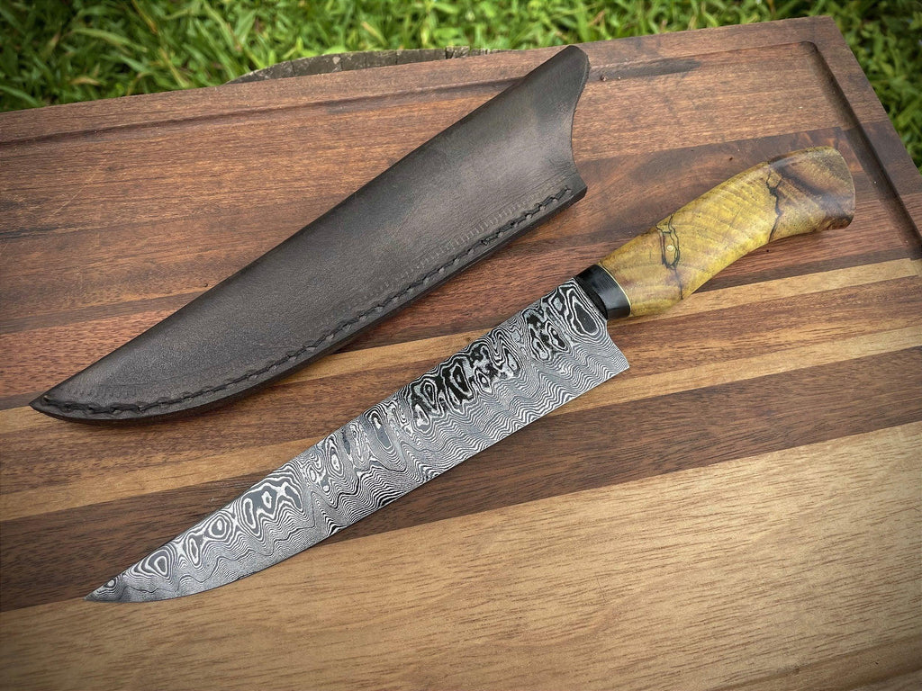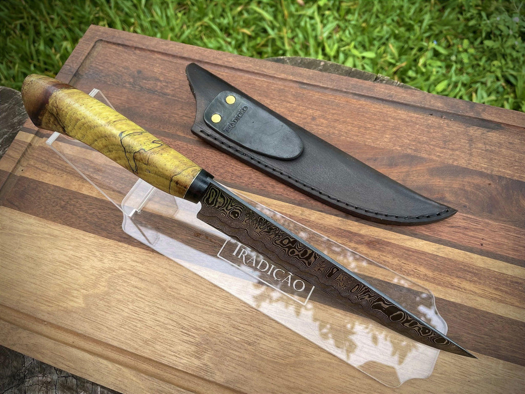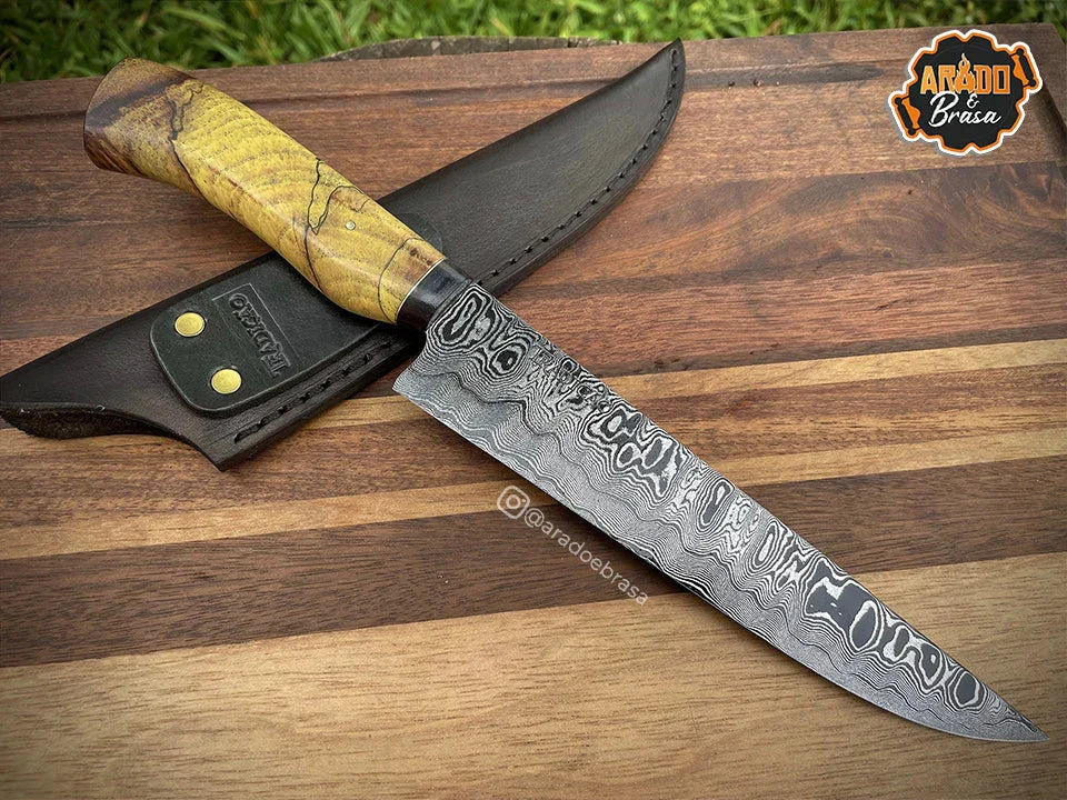 Faca estilo Churrasqueira, feita em damasco aleatório.